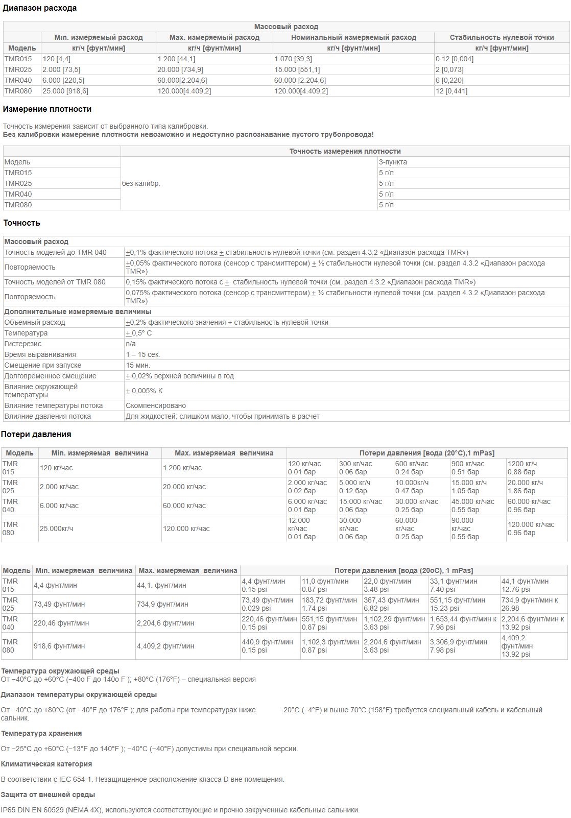 Сенсор TMR предназначен только для измерения массового расхода прямого и непрерывного потока жидкостей, независимо от их проводимости, плотности, температуры, давления и вязкости. Сенсор предназначен также для измерений массового расхода химически активных жидкостей, суспензий, патоки, красок, лаков и подобных им материалов. Действие Кориолисовых массовых расходомеров основано на принципе, что в любой вращающейся системе на массу точки, движущуюся к точке вращения или от нее, воздействует сила (известная как сила Кориолиса). Расходомер состоит из сенсора, установленного на трубопроводе, и трансмиттера (см. раздел 6 «Область применения TMR4» на стр. 32), который может монтироваться или непосредственно на сенсоре, или устанавливаться раздельно (например, на стене). Трансмиттер при помощи задающей катушки вызывает колебания в сенсорной трубке и принимает через катушку сенсора измеряемый сигнал, который пропорционален массовому расходу. После температурной корректировки измеряемый сигнал преобразуется в аналоговый выходной сигнал, согласованный с диапазоном измерения.