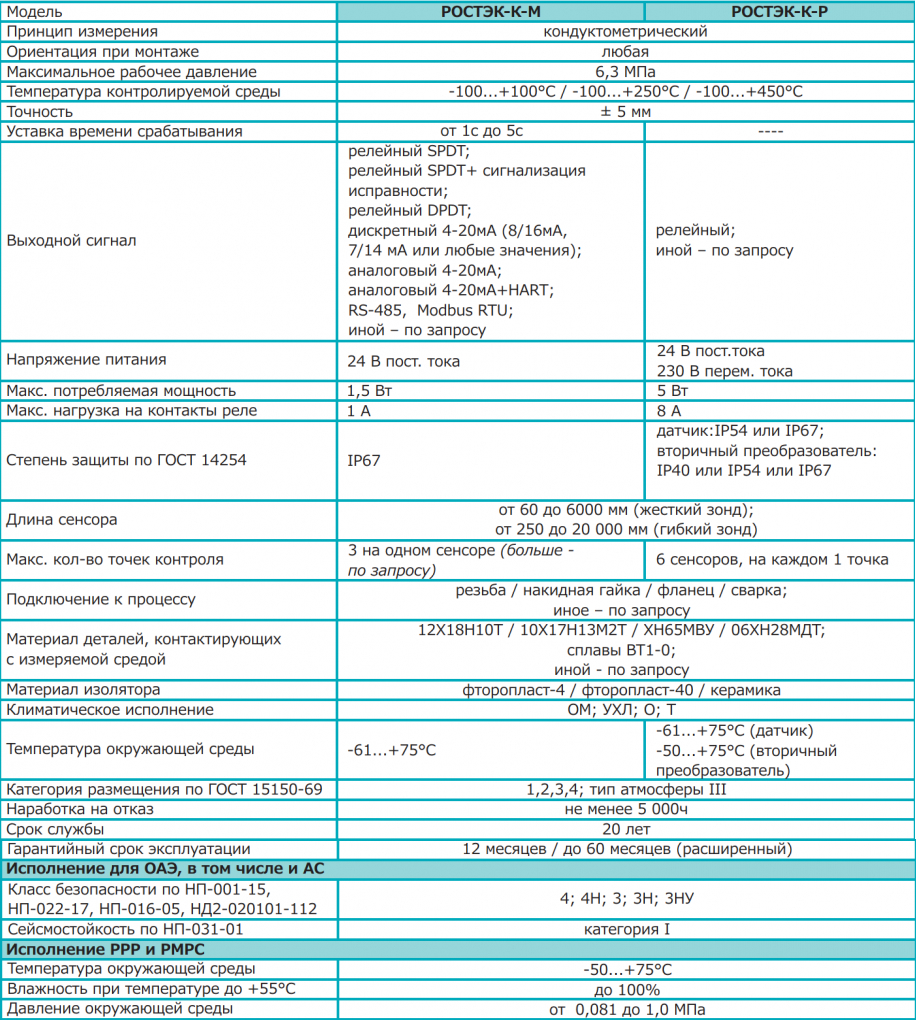 Сигнализаторы уровня РОСТЭК-К выпускаются по ГРВТ.407629.004 ТУ и предназначены для сигнализации предельных значений уровня жидких электропроводных сред или раздела двух жидких сред (неэлектропроводной и электропроводной) в одной или нескольких (до шести) точках контроля с выдачей в систему управления токового или релейного выходного сигнала о достижении уровнем среды каждой точки контроля.
