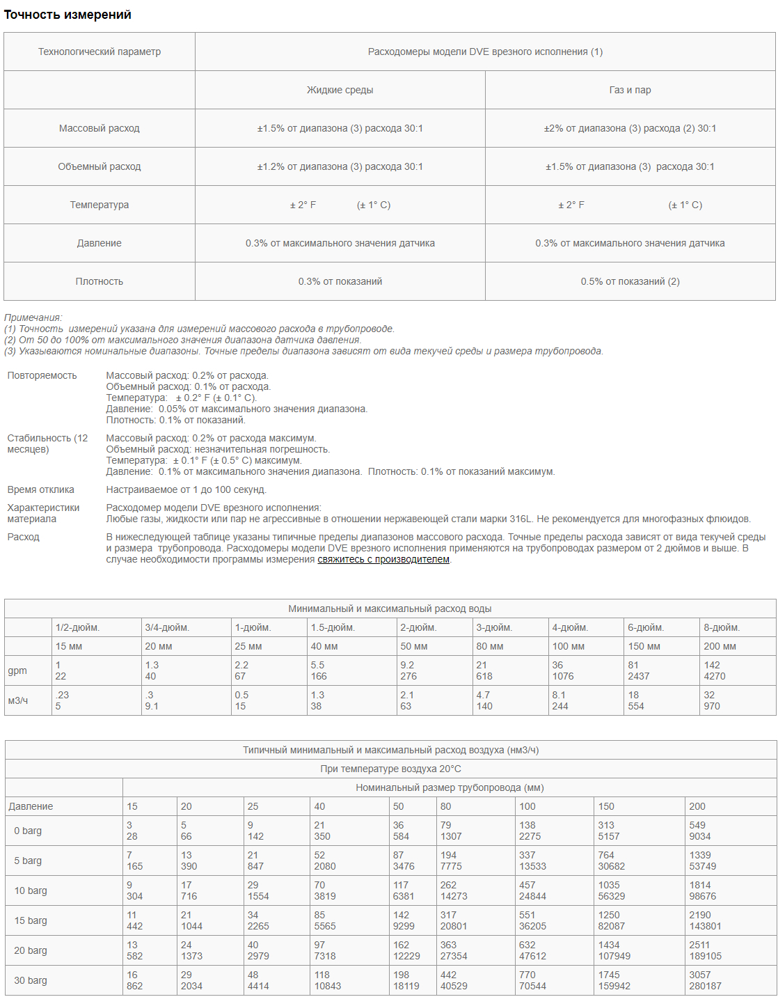 Врезные вихревые расходомеры модели DVE обеспечивают надежное техническое решение задач измерения расхода. При единственной точке погружения в трубопроводе, расходомер обеспечивает точные данные измерения массового или объемного расхода. Многопараметрические массовые расходомеры Для измерения массового расхода газа, жидких сред и пара в массовых расходомерах применяется три основных чувствительных элемента: датчик частоты вихреобразования, резистивный датчик температуры RTD и полупроводниковый датчик давления. Изделие поставляется в виде устройства с питанием по сигнальному контуру или же предусматривает до трех аналоговых выходных сигналов, передаваемых в диапазоне 4 – 20 мА, для контроля трех из пяти технологических параметров (массовый расход, объемный расход, температура, давление или плотность текучей среды). Опция контроля энергопотребления позволяет подсчет энергии, потребляемой оборудованием или процессом, в реальном масштабе времени. Объемные расходомеры Основным чувствительным элементом объемного расходомера является датчик частоты вихреобразования. Питание расходомеров осуществляется по сигнальному контуру. Аналоговые выходные сигналы 4 – 20 мА обеспечивают индикацию объемного или массового расхода на выбор. Принцип измерения массового расхода основывается на постоянной величине плотности текучей среды, записанной в запоминающем устройстве. И массовые, и объемные расходомеры могут поставляться с локальной клавишной панелью/дисплеем, обеспечивающим вывод данных мгновенного и суммарного расхода, и технологических параметров в единицах измерения. Также доступны исполнения с импульсным выходным сигналом для дистанционного суммирования и связи с протоколами MODBUS или HART. Цифровая электронная аппаратура DVE позволяет легкую реконфигурацию при эксплуатации с большинством газовых, жидких сред и пара. Простота установки расходомера производства Heinrichs сочетается с удобным для использования интерфейсом, обеспечивающим быструю настройку, долгое и надежное функционирование и точность измерений массового расхода в широком спектре диапазонов расхода, давления и температуры.